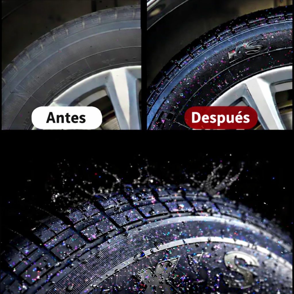 Tus neumáticos recuperan un negro intenso, con brillo limpio y un sutil efecto holográfico que cambia con la luz.